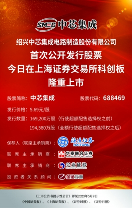 2023年5月10日,紹興中芯集成電路制造股份有限公司(公司簡稱“中芯集成”;股票代碼:688469)成功在上交所科創(chuàng)板上市發(fā)行,成為無錫創(chuàng)投集團(tuán)收獲的第44家上市企業(yè)、第13家科創(chuàng)板上市企業(yè)。