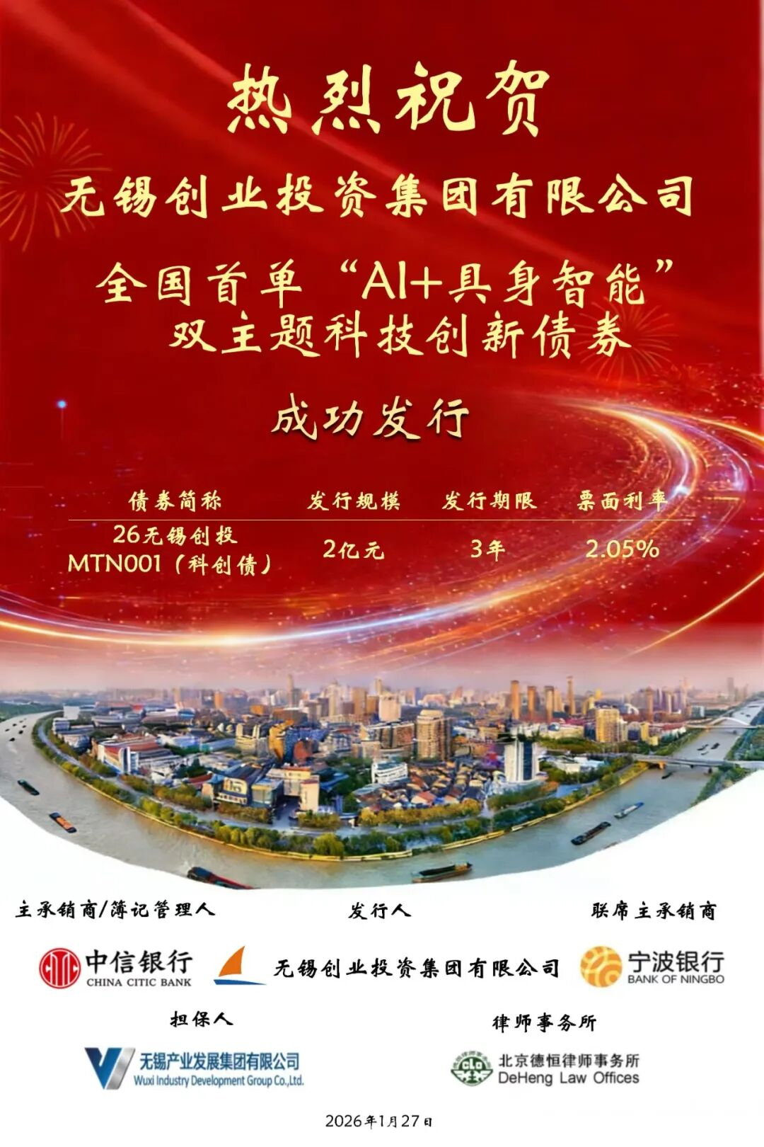 1月27日,全國首單同時聚焦“人工智能”與“具身智能”的主題科技創(chuàng)新債券在錫發(fā)行。無錫創(chuàng)業(yè)投資集團有限公司成功發(fā)行2026年第一期中期票據(jù),規(guī)模2億元,集中投向人工智能與具身智能賽道。這是繼去年成功發(fā)行全國首批科技創(chuàng)新債券后,創(chuàng)投集團再次運用金融創(chuàng)新工具,精準(zhǔn)引導(dǎo)社會資本投向科技前沿,為無錫乃至長三角地區(qū)關(guān)聯(lián)產(chǎn)業(yè)發(fā)展注入動能。